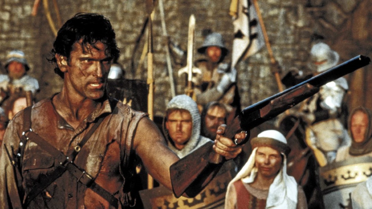 "Sam Raimi's lively third installment (1993) in his Evil Dead series begins with the hero, Ash (Bruce Campbell), crash-landing in the year 1300 along with his car, his chain saw, and his 12-gauge shotgun, then battling skeletons and engaging in other forms of sword and sorcery to get back to the present. Mercifully clocking in at 81 minutes, this enjoyably campy hokum combines A Connecticut Yankee in King Arthur's Court, Three Stooges slapstick, and frenetic comic-book pacing with special effects that seem like hand-me-downs from Ray Harryhausen's Jason and the Argonauts; it's calculated for ten-year-old boys of all ages and persuasions, whose howls of glee are programmed into the mock-macho material at regular intervals. Written by the director and Ivan Raimi, and costarring Embeth Davidtz, Marcus Gilbert, Ian Abercrombie, and Richard Grove." - Jonathan Rosenbaum